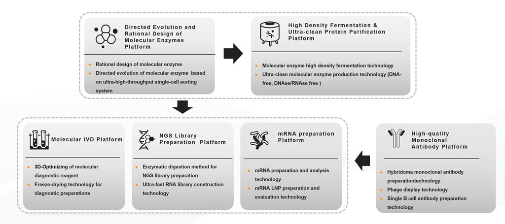 تشمل مجموعة المنتجات الأساسية للشركة فئات مختلفة، بما في ذلك تفاعل البوليميراز المتسلسل (PCR)، وتسلسل الجينوم التالي (NGS)، والنسخ العكسي، واستخراج الأحماض النووية وتنقيتها، والنسخ المختبري، والأجسام المضادة والبروتينات المعاد تركيبها، وتحليل الخلايا، وزراعة الخلايا، ونقل الخلايا، والكشف عن الجينات المراسل، وغيرها.