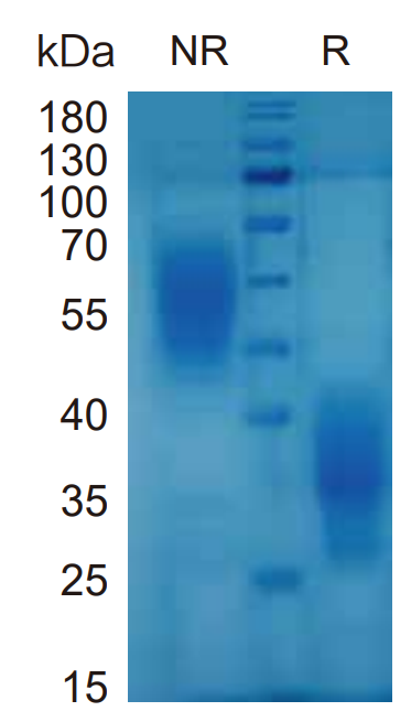 Figure 2.4 ug/lane protein was resolved with SDS-PAGE under non-reducing (NR) and reducing (R) conditions and visualized by Coomassie Blue staining.
